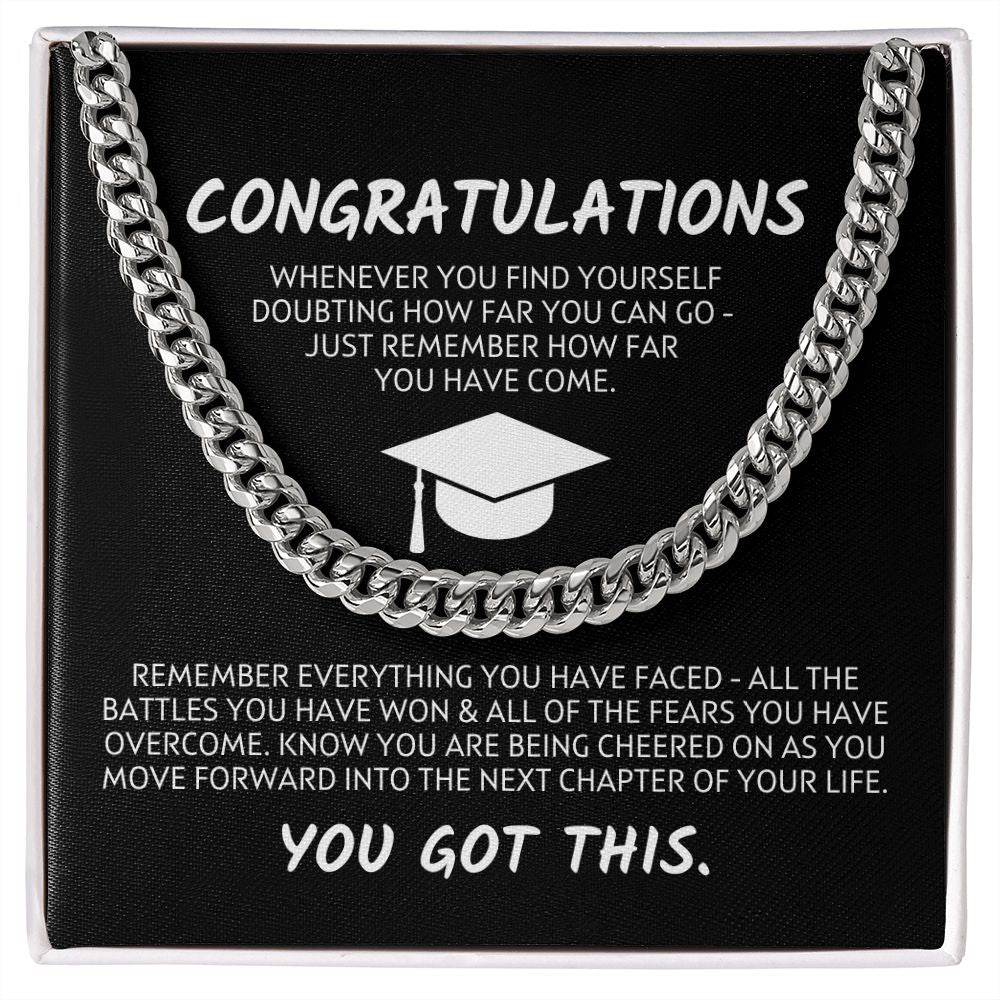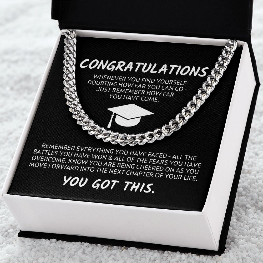 Can you imagine the look on his face when he opens this? This timeless Cuban link chain necklace is a perfect gift for your gift of encouragement and congratulations to the graduate in your life.