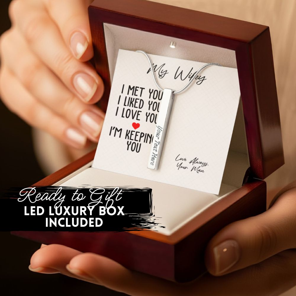Behind the necklace, your personalized message card says it all: “I met you. I liked you. I love you. I’m keeping you.” Signed with your names, it becomes a keepsake as meaningful as the necklace itself.