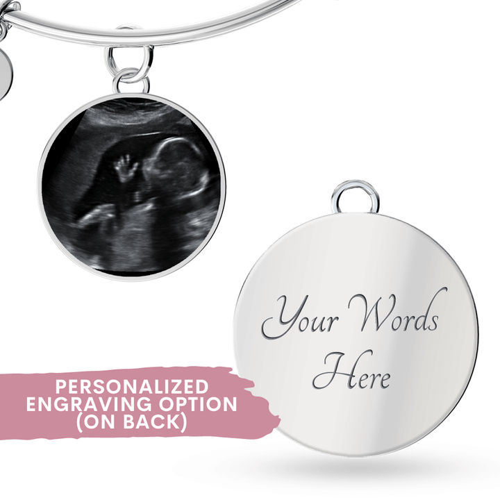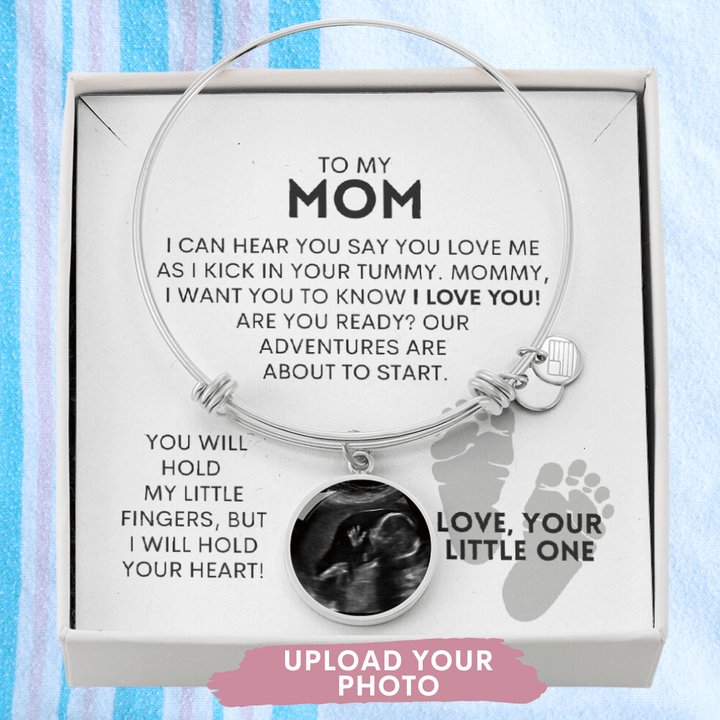 Can you imagine the look on her face when she opens this? This custom, made-to-order heart photo bangle bracelet is the perfect keepsake for an expectant mother or a first Mother's Day present.