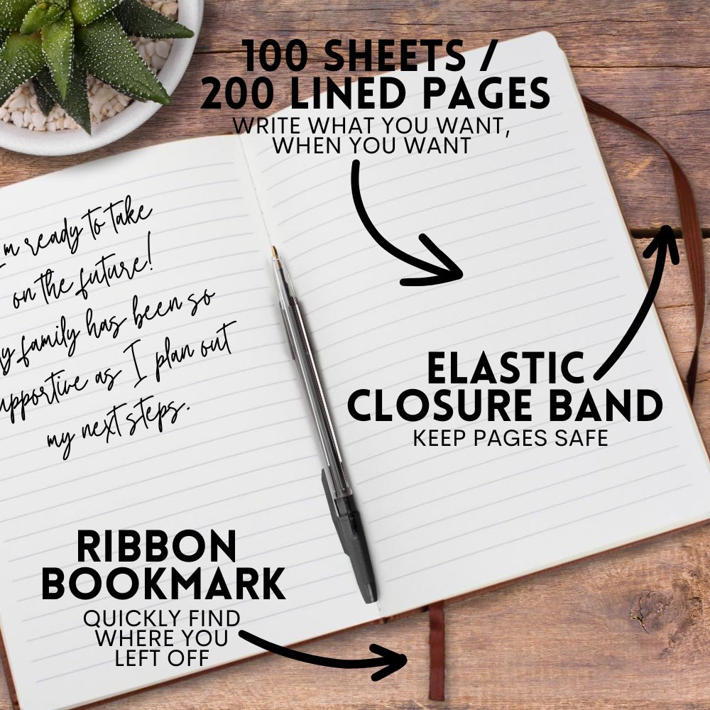 Thoughtfully designed with a smooth vegan leather cover, lined pages, a ribbon bookmark, and elastic closure band, it’s a practical companion with deeply personal meaning. Each one is custom printed to order, making it a heartfelt gift they’ll carry with them long after graduation day.